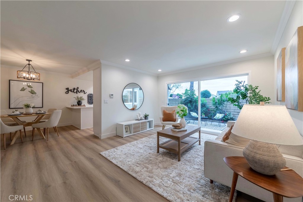 Stunning home in the sought-after "Summer Tree" community! This beautifully upgraded home is perfectly positioned in a prime location, just moments away from the prestigious Los Coyotes Country Club in north Buena Park. It's truly a standout property - almost everything has been meticulously upgraded and modernized! A true 10+! Surrounded by lush greenbelts, this home offers an inviting and serene atmosphere. The development itself is well-maintained and peaceful, with an idyllic community ambiance. This charming two-story end unit offers abundant natural light through numerous windows, with no neighbors above or below. The home's four spacious bedrooms and two updated bathrooms create the ideal setting for comfortable living. As you enter, you'll immediately notice the open-concept floor plan that flows seamlessly. A grand double-door entry leads you into the warm and welcoming living room. The MAIN FLOOR PRIMARY BEDROOM AND BATHROOM has been fully upgraded, offering convenience and comfort. You'll love the gorgeous waterproof laminate flooring that spans the home, along with the elegant vinyl dual-pane windows and sliding doors. The residence also boasts crown molding, scraped ceilings, and a freshly painted interior, enhanced by recessed lighting and upgraded light fixtures throughout. The kitchen has been completely remodeled with Quartz countertops, a custom tile backsplash, and shaker-style white cabinetry. Stainless steel/black appliances complement the modern aesthetic. The casual living room completes this space, with a sliding door that opens up to a generous-sized private patio - perfect for hosting family and friends, gardening, or simply enjoying your morning coffee. The community offers fantastic amenities, including a pool, spa, greenbelts, and a clubhouse. Located in a highly convenient area, you are just a short walk from shopping centers, restaurants, banks, parks, and grocery stores. Public transit options, including MetroLink, are easily accessible, and golf courses are nearby. With direct access to the 2-car garage and ample guest parking, convenience is key. This home is also within walking distance of Smith Murphy Park and Beatty Elementary/Junior High School. Both bathrooms have been fully remodeled with stylish finishes. Whether you're looking for your dream home or a lucrative investment property in Buena Park, this spectacular home checks all the boxes.